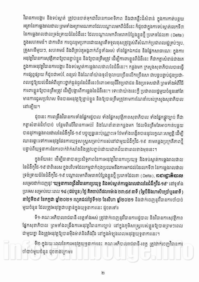 Voir Circulaire n°04S du 28 juillet 2021 du Gouvernement Royal du Cambodge sur le lancement d'une campagne de renforcement des mesures de prévention et de prévention de la propagation du Covid-19