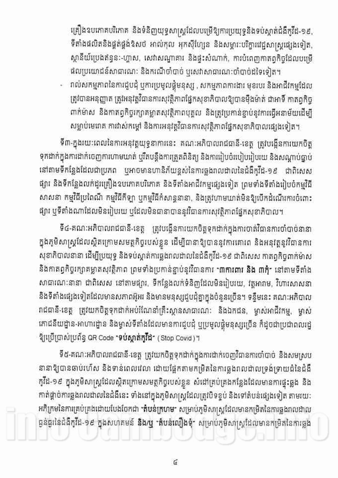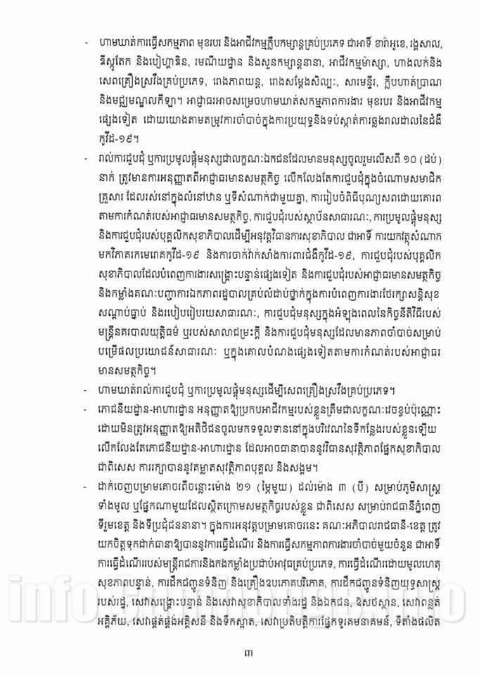 - Appliquer un couvre-feu de 21h00 à 3 h00 pour l'ensemble de la géographie ou toute partie sous sa juridiction, notamment pour Phnom Penh et les villes de province.